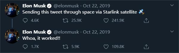 图2:2019年10月,马斯克发布推特对星链网络进行了测试,获得成功。来源:twitter