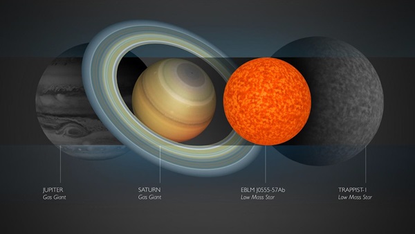 最小的恒星仅略大于土星,它就是EBLM J0555-57Ab,简称57Ab,它的质量刚好能使氢原子核聚变成氦,57Ab距离地球大约600光年,是一个双星系统的一部分,当它从更大的伴星前方经过时能被识别发现。
