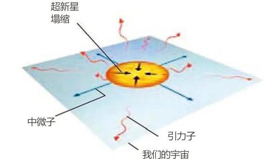 大质量的恒星向内塌缩产生超新星,并向外放出大量冲击波。科学家一般认为这些能量是被中微子带走的(图中蓝线所示)。假如存在额外维,那么辐射出的引力子(图中红线)将会把更多的能量带到额外空间中去。如果引力子带走了太多的能量,超新星就不能形成,所以理论物理学家可以通过超新星的观测数据,给额外维模型的性质设置一个约束。
