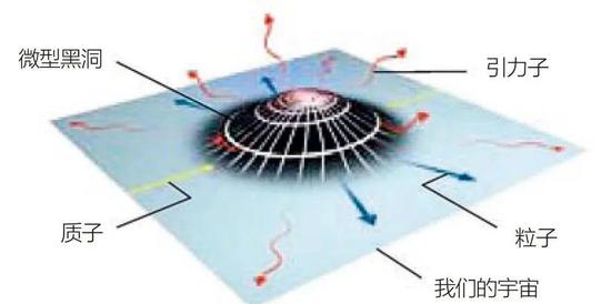 当粒子加速器中的两个高能质子(图中黄线所示)碰撞在一起的时候,有可能产生微型的黑洞。这些黑洞会以霍金辐射的形式,向外释放出标准模型粒子(图中蓝线所示)和引力子(图中红线所示),从而很快蒸发掉。