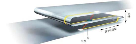 在我们宇宙之外,可能存在着很多个平行宇宙。每个宇宙都处在自己的膜空间上,相邻两个膜空间可以只距离一个毫米。这些平行宇宙也可以理解为是我们的宇宙折叠形成了很多的层。在平行宇宙理论中,传统理论中所说的暗物质,其实就是位于相邻平行宇宙上的恒星和星系。平行宇宙中恒星和星系产生的引力(图中红线所示),可以通过额外维这个捷径,传到我们地球,但是由恒星和星系产生的光(图中黄线所示)则只能沿着膜空间传播,这至少需要数十亿光年的时间,才有可能到达我们地球。