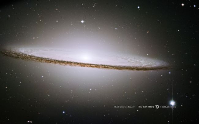 草帽星系:这是星系NGC 4594的侧面图像,该星系也被称为草帽星系,图中呈现明亮的白色核心被厚密的尘埃带包围着。