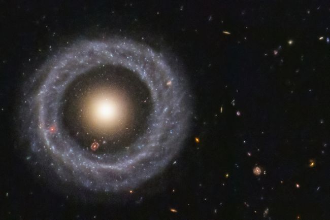 霍格天体:一个完美的对称圆环结构环绕着一颗红色恒星,图中的霍格天体是宇宙中最美丽的神秘天体。它是一种罕见的环状星系,直径大约10万光年,距离地球6亿光年。