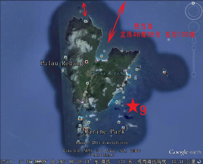 泰国湾里的马来西亚热当岛(音译),箭头指向n形区。
