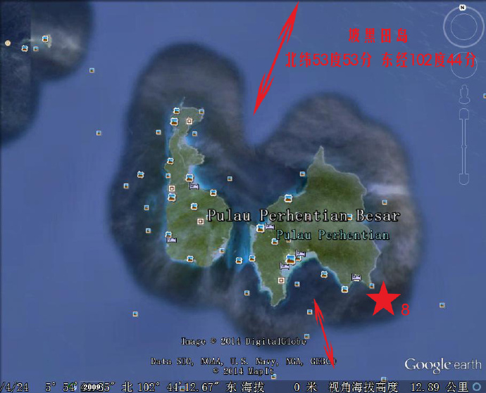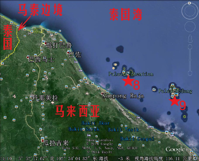 符合特异功能人A遥视的马泰边界交界附近的两个岛屿8和9