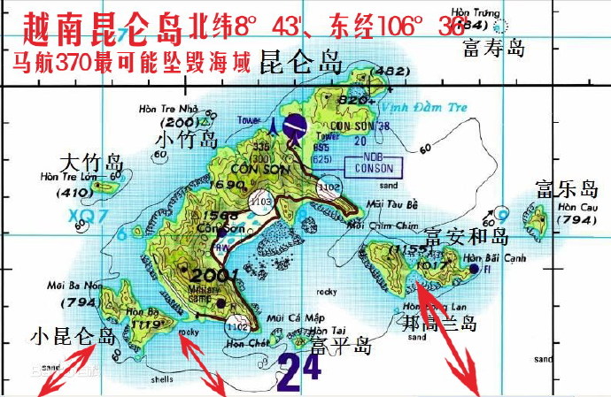 特异功能人A和C都遥视,马航370从失联点向左飞,我根据他们一个从机尾顺着看一个从机头迎着看,分别解读为马航370向西南飞和向东北飞。A和C都看到马航370坠毁附近有岛屿,岛屿有n形开口,A还画出马航370坠毁海域附近的岛屿成倒V形开口。A说马航370坠毁在两个国家交界附近。我从C遥视定位马航370的情况判断他遥视到的岛屿很可能就是越南昆仑岛,越南昆仑岛离中国南海九段线涵盖海域不远,也可视为是中越两国交界附近。