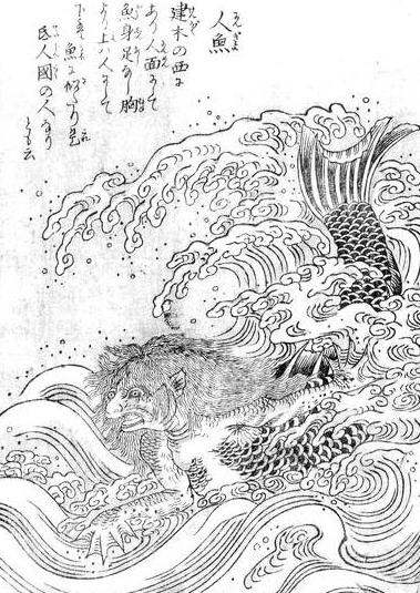 很久以前,推古天皇二九年(西元六一七年),在近(滋贺县)的蒲川被渔夫捕获,江户时代也发生过,尤其是宽政十二年(西元一千八百年),身高一公尺多,发出婴儿似的哭声。从这件事来考虑,人鱼也是传说中的幻兽,可算是相当神秘的鱼族,当时称为鲮鱼或发鱼。就这点而言,日本人的人鱼和西洋传说中的妖精人鱼的意思稍微有些不同。其姿态,不一定很美,不如说是奇形怪状较多。出现于若狭湾、九州、四国近海,只选在狂风暴雨迫近时现形。
