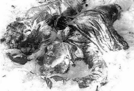 1. 死于当地的土著曼西人(Mansi)的袭击。因为事发当地属于曼西人的领地,而且割去入侵者的舌头也很符合他们的行为,然而,并没有任何证据表明,事故发生时除了九名遇难者外,该地区还有其他人存在。而且现场也并未发现存在搏斗的迹象,根据鲍里斯医生的说法,死者身上的打击伤不可能是人力做到的。