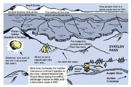 1959年一月底,前苏联乌拉尔山区,一个由十名登山队员组成的探险小队正在冰天雪地中艰苦跋涉着。十名队员都是训练有素、经验丰富的登山爱好者,且大都来自乌拉尔工业学院(嗯,叶利钦也毕业于这所学校,他后来把其改建为乌拉尔联邦大学)。十个人中有八名男性,两名女性,年纪最大的38岁,年纪最小的21岁,可以说都是精力充沛的年纪。