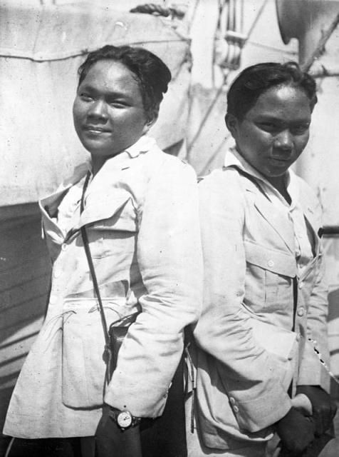 1930年时的Godina双胞胎。这对双胞胎出生于1908年的菲律宾,后来前往美国,开始表演杂耍。他们在骨盆处相连,这在男性连体双胞胎中非常罕见。