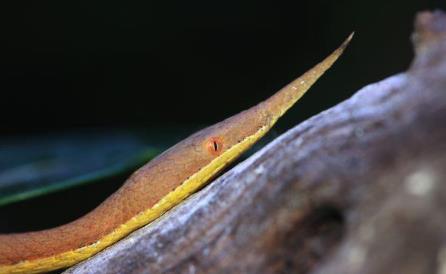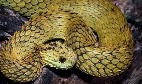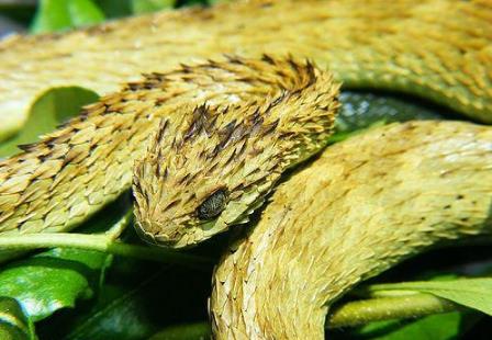 叶鼻蛇现已习惯了树栖日子,首要以蜥蜴为食。它最风趣的特点是长着古怪的角,或称凸起的大鼻子。叶鼻蛇是国际上最古怪的一种爬虫类。