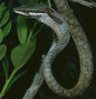藤蛇(Thelotornis kirtlandi)又称为鞭蛇,为游蛇科下的瘦蛇属,归于后齿型的有毒蛇种(杀伤力较低),藤蛇呈绿灰色,杂有含糊的横带纹;舌黄色或赤色,舌尖黑色,专用与诱惑猎物;能咬人致死。相对于眼镜蛇或蝰蛇一类具高度攻击性的毒蛇而言,藤蛇的毒素则首要在于朝口腔内曲折的后排牙齿里排泄,因而在面对猎物时并不如前面说到的蛇类般简单发挥其毒素。
