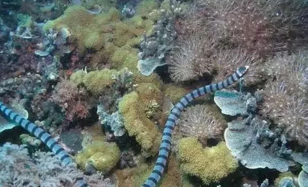 【巨环海蛇】体长约两公尺。栖息于海洋,食物以鱼类为主,卵生,有剧毒,毒牙小,一次分泌的毒液较少,也捕食鳗鱼等。它的右肺几乎占据了身体的右半部分。潜入10丈深的水里分分钟的事,它属于水陆两栖蛇类。如果没毒,看起来还萌萌哒。
