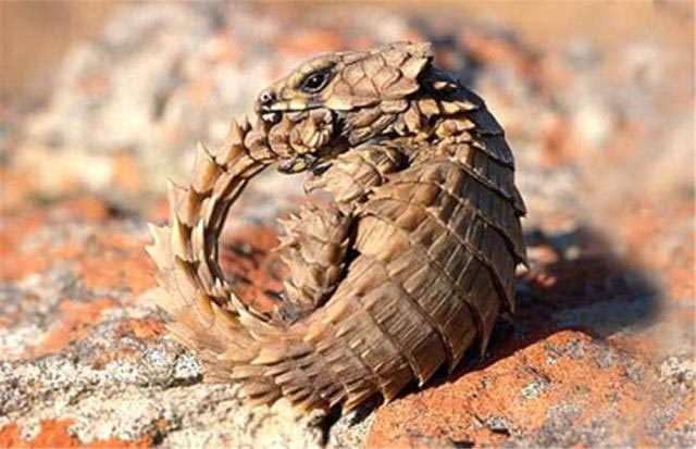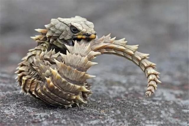 展开鳞片之后,这个聪明的小家伙儿还会从坡上往下快速滚动,借此逃避它的天敌呢。这样说来它倒是与刺猬,穿山甲倒是有点儿异曲同工之妙了。跟同类的壁虎相比,南非犰狳蜥的做法显得更为明智,因为咬住尾巴总比丢掉尾巴好。