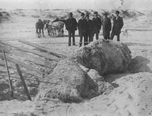1960年8月,一具巨大的尸体被冲上塔斯马尼亚西海岸,尽管没有可识别的骨骼组织,一开始它被认为是猛犸象的新物种,但第一次试图定义它的生物学家们失败了。当时报纸对这个奇怪生物的描述,大多是没有眼睛,在嘴的位置有长牙状凸起,全身布满白色硬毛。直到1981年胶原纤维分析法出现,它的真实身份才被揭开,是一头鲸的尸体。1970年还有一则类似的发现,但是那只生物的照片下落不明。