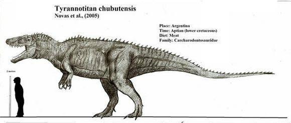 南方巨兽龙,属于兽脚亚目肉食龙下目鲨齿龙科,巨兽龙生存在白垩纪中期(1亿年前至9200万年前的森诺曼阶)的阿根廷,硕大而狭长的长嘴巴长着一口很锋利但单薄的牙齿。它有很可怕的咬合力和很快的撕咬速度以及如同餐刀一样锋利的薄牙,它走路用两条小短腿。根据化石标本显示,南方巨兽龙最大个体长13.8米,臀高4米,总身高在4.2米左右,重达10.52吨,头颅骨长度175厘米。