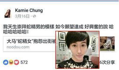 据悉,中国有一名网红,被网民称作蛇精男,而Kamie Chung在被戏称蛇精女后在网上发言称我天生崇拜蛇精男的模样,如今愿望达成,好兴奋的说。