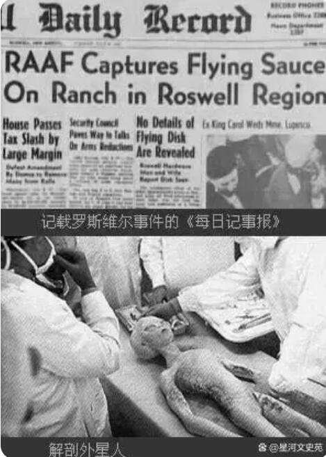 1947年7月8日晨,美国新墨西哥州罗斯威尔市《每日新闻报》全文登载了罗斯威尔空军基地司令朗查德上校签发的新闻公报。公报的主要内容就是:空军在罗斯威尔发现坠落飞碟!