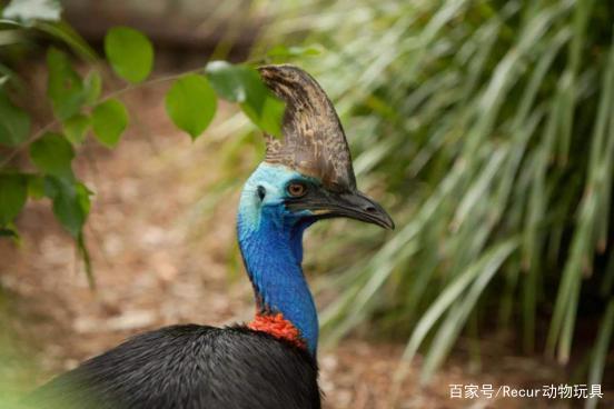 但鹤鸵比鸵鸟更好看,它们浑身长满漆黑的羽毛,头顶上有一个高高的角质冠状物,脖子是蓝色的,下巴上却长着又红又长的流苏状皮肤,有点像火鸡。