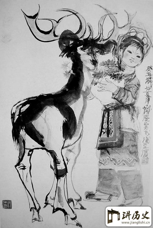 《少女与鹿》描绘的是一鹿一少女,少女持花而立,面含微笑。鹿为祥瑞之物,常常被纳入画家的笔端,与人物相映衬,用以营造一种祥和的景象。夸张、对比是程十发常用的表现手法,因此他的画,即使是寻常景物,也容易吸引人的眼球。少女的形象,显然借鉴了泥人的造型,圆脸鼓腮,有漫画的意味。衣饰的线条细密复杂,色彩也绚丽斑斓,而鹿的刻画则非常简略粗犷,一主一宾,形成强烈的对比。