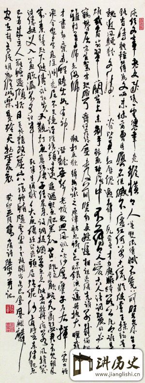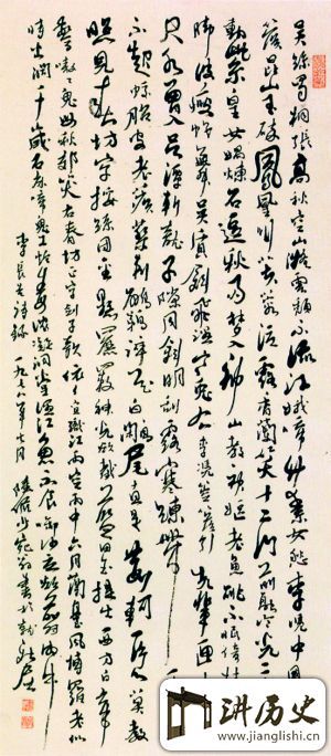 但不管怎么说,疑伪终归是疑伪,现在我只要提出以下两个问题,便可证明。一是我所接触到的陆俨少直条幅的书法作品,通常都是作画之余偶尔为之,一般都只写一首律诗或绝句的字数,我从未见过有写到洋洋洒洒数百字的,那为什么到作者逝世十多年后有这么多笔墨特征相像的书法“巨制”一下子都到各地拍卖行去“挤兑”?二是图一与图二两成品的字体面目基本一致,但署年的时间跨度却很大,图一署的是“癸卯”(1963年),图二署的却是1978年,若它们真的书写时间相隔了15年,那字体有可能“一成不变”吗?