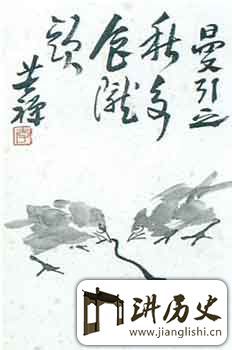 伪作《双鸡图》,纸本水墨,纵38厘米,横27厘米。款题:“曼引之秋,争食陇头。苦禅。”钤“李”朱文方印。该伪作画两只小鸡于地争食蚯蚓,其构图和款题均摹自苦禅1964年所作《曼引之秋》。真迹曾刊于《荣宝斋画谱(十七)花鸟部分・李苦禅》第14页,现藏李苦禅纪念馆。苦禅作画,立意重情趣,构图讲张力,笔墨求健劲。其构图有平摆式、大开大阖式、层次错综式、纵横相破式、以上抱下式、以近推远式、太极旋转式、斜贯全局式等,多取横、斜、圆、纵诸势。伪作虽矩步于苦禅真迹,只是在款字中少书“一九六四年”五字,印章则将真迹“李氏苦禅”朱文长方印改成“李”朱文方印。伪作中画的小鸡,虽用浓墨画鸡喙和鸡眼,但用笔过分尖利,无朴拙含蓄之趣。用浓墨写鸡身,由于纸太熟,故墨色晕化不开,浮浅呆滞,缺乏水的痕迹和毛茸感。所画鸡爪,用笔乏力,时时露出败笔。伪作款字,虽有范本可摹,但作伪者功力不及,用笔乏圆润、自然之趣,而独生僵硬之态,尤其笔画之起讫,显露伪态,“苦禅”二字名款,极不自然。纵观全画,用笔浅薄,笔墨单调,伪作无疑。