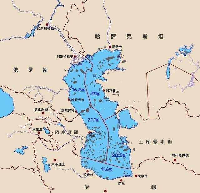 就这样,里海被5国分割。其中俄罗斯得16.8%,合面积6.552万平方公里;哈萨克斯坦得30%,合面积11.7万平方公里;土库曼斯坦得20.5%,合面积7.995万平方公里;伊朗得11.6%,合面积4.524万平方公里;阿塞拜疆得21.1%,合面积8.229万平方公里。(喜欢的话多多关注,多多点赞,多多收藏,转发和评论,谢谢!本人其他文章也很精彩,欢迎品读!