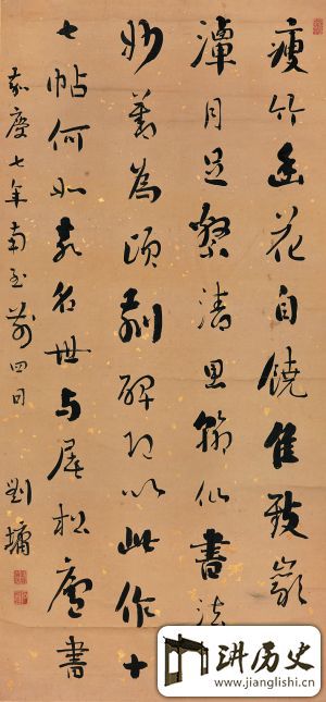 再回过头衡量图1书作,其笔线过于平实,墨迹好像只留存于纸的表面,尚不能沉浸入纸,这样每个字笔划的厚度和力度就显得不足,因此气韵神采就大打了折扣,另外其章法编排上也让人感觉到很不自在。综合种种迹象,我判断图1成品的原始书者很可能是民国时期的刘体书法“传人”,后疑是该成品被挖去款章,另加盖一方“刘墉之印”的特大号印章,以掩盖材质的挖补痕迹。请大家再认真看一下图2这件典型的刘墉书法,它一入眼就具有很高的艺术性,以其笔墨特点和质量作评价,称其“柔中带刚”、“平中寓险”应该一点都不为过。