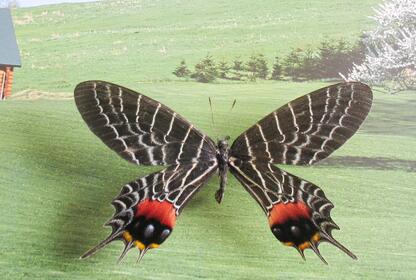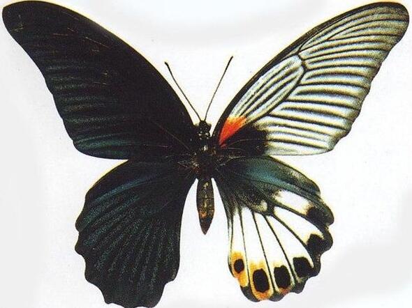 中国凤蝶科里极其罕见的雌雄同体的蝴蝶,此蝴蝶一半为雄性蝶黑色的翅膀,一半为雌性蝶白色的翅膀,有两套生殖器官,是遗传基因的变化。产自于中国云南省勐腊县。