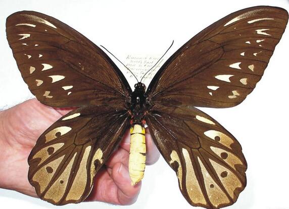 现已知是世界上最大的蝴蝶,其名字是位了纪念英王爱德华七世的妻子亚历山大皇后而命名的。翅膀的花纹和颜色异常诱人,后翅反面金黄色。由于火山爆发的原因破坏了栖息地,这种蝶类已经成为濒临灭绝物种,数量稀少,市场价格高。
