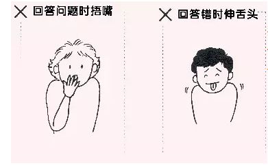 ①在回答问题时,态度要诚恳,目光要在提问者身上,不要东张西望,也不要低着头,更不要做小动作,东张西望说明你态度不认真,低着头说明你不敢面对。