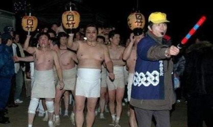 裸体节又叫会阳节,是日本三大奇异节日之一。参加者都是男性,他们只系日本传统的兜裆布,几近全裸。每年2月的第三个星期,是举行裸体节的日子,而星期六晚上的活动是高潮,每年的这一天都有近万名男子赶来参加裸体争抢宝木的仪式,参观者也不计其数。
