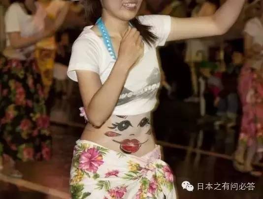 将肚皮当做脸蛋日本涩川市的肚脐眼节在该国相当有名,因为涩川地处日本的中央,大约肚脐的位置,所以被叫做肚脐祭。参加这个表演的男女老少,都要把肚皮露出来,将整个肚子当作脸孔,上面再戴一顶大斗笠;这样远远的望过去,就好像是一张大脸在跳舞。