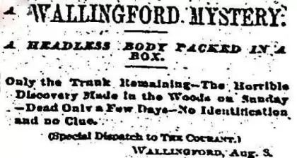 1886年,有人在康涅狄格州的树林里发现一个鞋盒。里头有一个人的躯干,既没有双臂、双脚、也没有头颅。经过调查,发现这个盒子是来自一家位于芝加哥的鞋业公司。老板宣称,数个月前有一名神秘男子曾购买了鞋盒。但最后如何会出现在康涅狄格州,以及里头的内容物,这一切仍然是个谜。