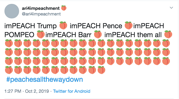 一位美国网友想要弹劾走特朗普、彭斯、蓬佩奥等官员,并附上一堆桃子表情。/推特截图