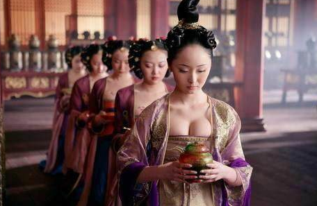 唐代的女装基本上是裙、衫、帔的三件套。在这种装束下,女性出现了袒胸露背的形象。尤其是在女皇帝武则天之后,女性社会地位空前,穿着也就更加自然大胆了。唐代诗人方干的《赠美人》诗中说:“舞袖低徊真蛱蝶,朱唇深浅假樱桃。粉胸半掩疑晴雪,醉眼斜回小样刀。”形象的描述了“粉胸半掩”的低胸装,唐代人的衣着简单总结,可以归类为薄、透、露。当然这种装束只流行于当时的官宦家庭和大户人家闺房之中。唐代人的开放是一种从上而下的开放,从皇帝后宫开始,直到市井小民,在两性方面都很开放,我们看一些历史剧,以为唐太宗和长孙皇后很恩爱,但其实唐太宗也是个好色之徒,他霸占了他的弟弟李元吉的妃子杨氏,而且他的妃子特别多,其他的诸如御女才人就更多了,武则天也是其中一个,史学家肯定两人是发生过关系的,但是唐太宗的儿子李治又看上了自己的这个庶母,并且娶她为妻立她为皇后。
