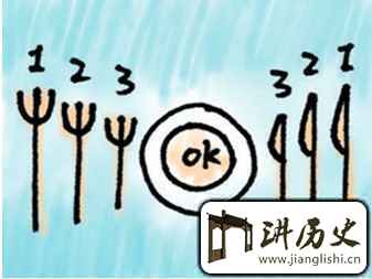 吃完每碟菜之后,将刀叉四周放,或交叉乱放,非常难看。正确方法是将刀叉并排放在碟上,锯齿朝上。